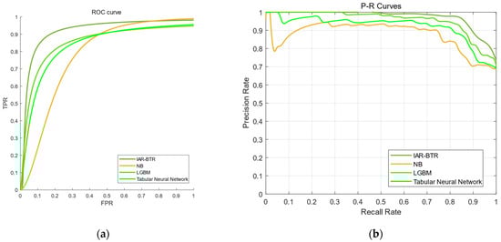 ROC and PR curves (a) ROC curves of IAR-BTR, LGBM, Tabular Neural Network and NB; (b) curves of IAR-BTR, LGBM, Tabular Neural Network and NB.