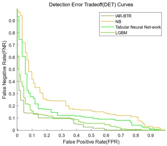 DET curves of the IAR-BTR, LGBM, Tabular Neural Network and NB models.