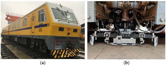 Rail magnetic flux leakage detection system: (a) GTC-80 rail inspection vehicle. (b) Rail magnetic flux leakage (MFL) detection probe.