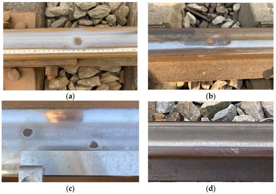 Four typical types of natural rail defects: (a) Rail abrasion; (b) Rail spalling; (c) Rail indentation; (d) Shelling.