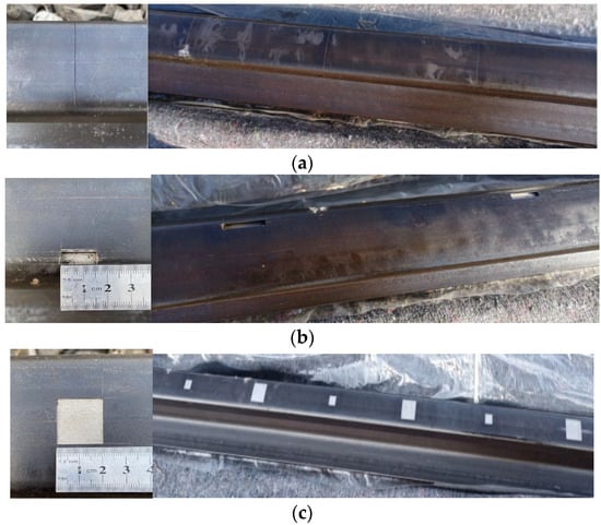 Physical images of four types of artificial defects: (a) Physical image of artificial transverse crack defect on rail surface; (b) Physical image of artificial spalling defect at gauge corner; (c) Physical images of artificial defects—abrasion and indentation on rail surface.