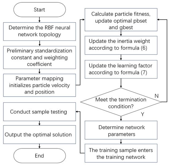 The PSO-RBF optimization maps neural network parameters to particle positions, using minimum mean square error as the fitness function to determine optimal weights. The complete algorithm flowchart is presented in Figure 5.