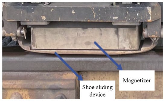 The magnetic flux leakage (MFL) detection system is mounted on a GTC-80 rail inspection vehicle for high-speed rail inspection [21]. The system consists of core components including an industrial computer, signal conditioning circuit, data acquisition card, power supply box, and detection probes. The detection probes employ an array of Hall sensors (single sensor size: 1.5 × 1.5 mm2, minimum center spacing: 2 mm) installed between the wheel sets of the bogie. During inspection, the train moves at a constant speed of 40 km/h, while the magnetizers and sliding shoes positioned before and after the probes work in coordination to achieve continuous scanning of rail defects. The signals are biased and amplified by an AD620 instrumentation amplifier and then stored in real time by the data acquisition system. After detection, dedicated playback software is used to locate suspected defect signals, which are then manually verified to confirm the damage location [22]. See Figure 6.