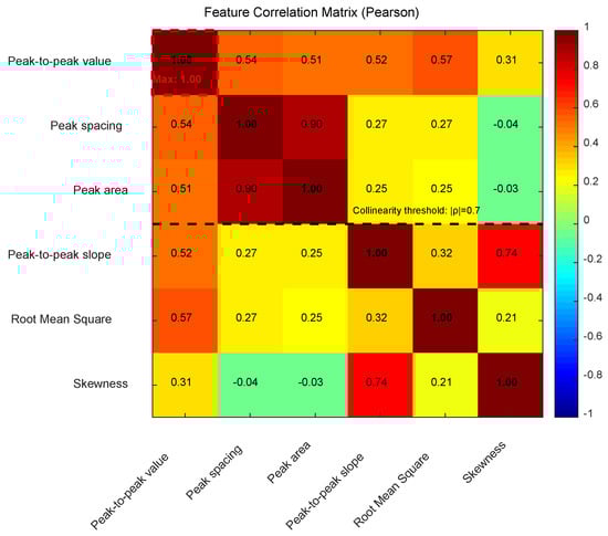 Figure 7 displays the Pearson correlation matrix among the six key features. As shown in the figure, peak spacing and peak area exhibit a strong positive correlation (ρ = 0.90), indicating their co-variation in signal morphology, while the correlation between peak-to-peak slope and skewness is moderately high (ρ = 0.74), suggesting that signal asymmetry may influence slope characteristics. Notably, skewness shows negligible linear dependence on other features (e.g., ρ = −0.04 with peak spacing), consistent with its role as an independent discriminator identified earlier. The red markers (ρ > 0.7) in the figure further highlight the collinearity between peak spacing and peak area. To address this, principal component analysis (PCA) was applied during model training to reduce feature dimensionality and mitigate multicollinearity-induced bias in predictions [23,24,25].