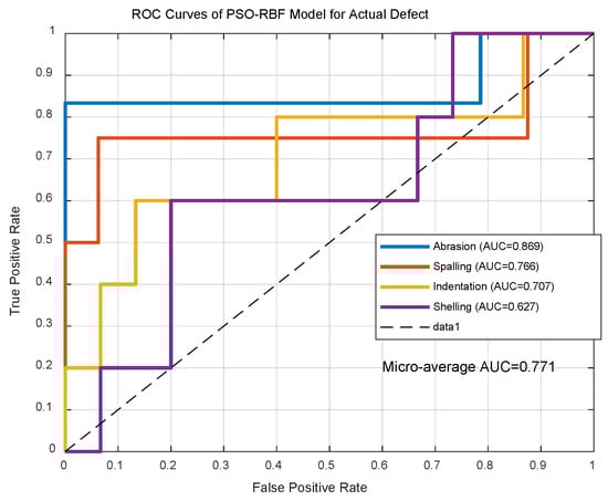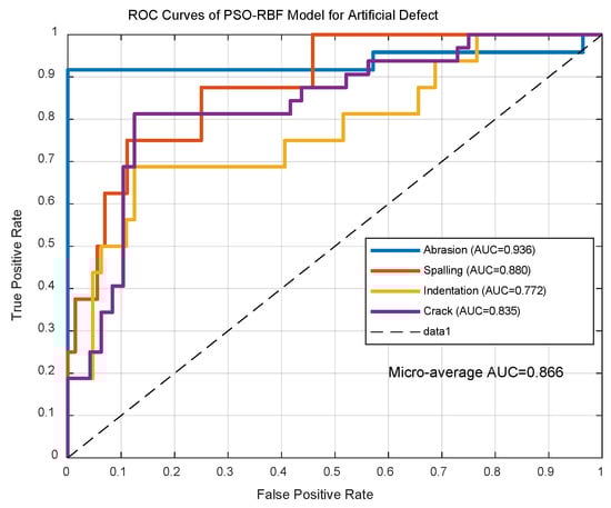 As shown in Figure 11, PSO-RBF achieved 0.866 ± 0.02 micro-average AUC (spalling: 0.88), surpassing conventional RBF (AUC = 0.82). With consistent inference time (5.2 ± 0.3 ms/sample), it meets real-time requirements (<1.25 ms/meter at 350 km/h). The accuracy improvement is statistically significant (p = 2.7 × 10−6, Cohen’s d = 1.43).