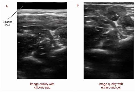 Utilizing silicone pad instead of ultrasound gel: Image quality using silicone pad (A) and ultrasound gel (B).