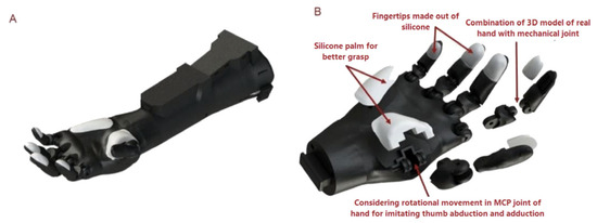 The design of ProRuka: (A) The design of ProRuka, a 3D-printed, lightweight, cost-effective, and multi-degree-of-freedom prosthetic hand; (B) an exploded view of the prosthesis.