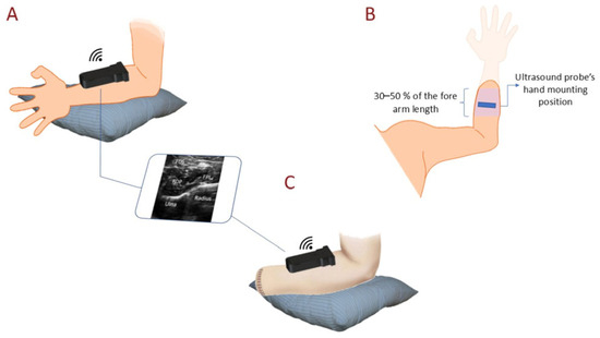 The volunteers were asked individually to sit in a comfortable position, put their hand on a cushion, and keep their palm upwards. A B-mode lightweight (only 67 g) wireless ultrasound module (Model UL-1C, Beijing SonopTek Limited, Beijing, China) was fixed on the forearm using a customized case (Figure 5A,B). To collect the maximum amount of muscle activity, the probe was placed perpendicular (transverse) to the forearm within 30% to 50% of the length of the forearm from the elbow (Figure 5B). Moreover, to minimize the effect of transducer relocation on accuracy, data were collected at different transducer locations.