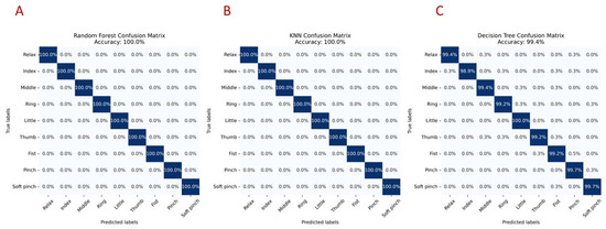 The results of the offline test: Offline test results for classifying nine different hand gestures in the 10 able-bodied participants group. VGG16 was used to extract features from the collected data, and these features were used to train an RF, KNN, or DTC model. The figure shows confusion matrices for hand gesture classification using the (A) Random Forest, (B) KNN, and (C) decision tree algorithms.