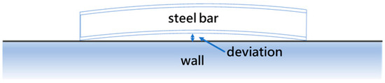 As shown in Figure 14b, with a vertical height h = 707, the is is calculated using Equation (4) as 518 (518 = 707 × 0.733). In practice, the edge line lengths must be corrected based on the steel bar’s tilt angle, denoted as . The corrected length is obtained by multiplying the original length by sin, as defined in Equation (10).