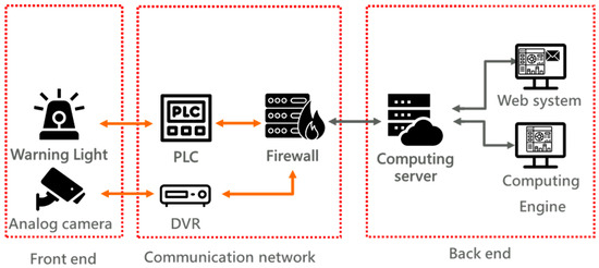 The proposed steel bar straightness recognition system integrates a camera, a digital video recorder (DVR), a computational server, a programmable logic controller (PLC), and a visual warning indicator. The system architecture, as depicted in Figure 3, operates as follows: the camera captures real-time imagery of the steel bars and transmits these data to the DVR via a coaxial cable. Subsequently, the DVR streams the video feed to the computational server where a Computing Engine, in conjunction with the steel bar straightness recognition algorithm, processes the imagery to quantify steel bar straightness. If the measured straightness deviates from predefined standards, the server sends a signal to the PLC, which then activates the warning indicator to alert on-site personnel. Additionally, a web-based user interface enables real-time monitoring of steel bar production and recognition status by authorized personnel.