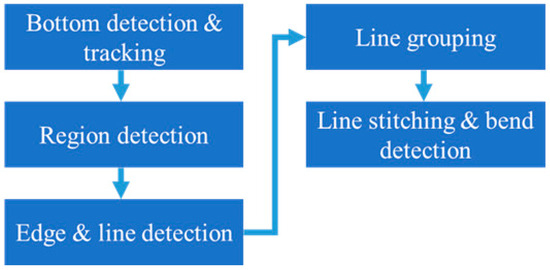 The proposed algorithm employs a five-stage process to determine steel bar straightness: bottom detection and tracking, region detection, edge and line detection, line grouping, and line stitching and bend detection. The algorithmic workflow is illustrated in Figure 4. Each stage is detailed in the subsequent sections.