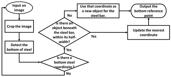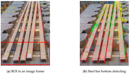 The steel bar bottom detection and tracking algorithm, illustrated in Figure 5, begins by defining a region of interest (ROI) for bottom detection, as shown in Figure 6a. The input image is then cropped to isolate the bottom recognition region, facilitating the identification of the steel bar bottoms, as shown in Figure 6b with the red rectangle markers.