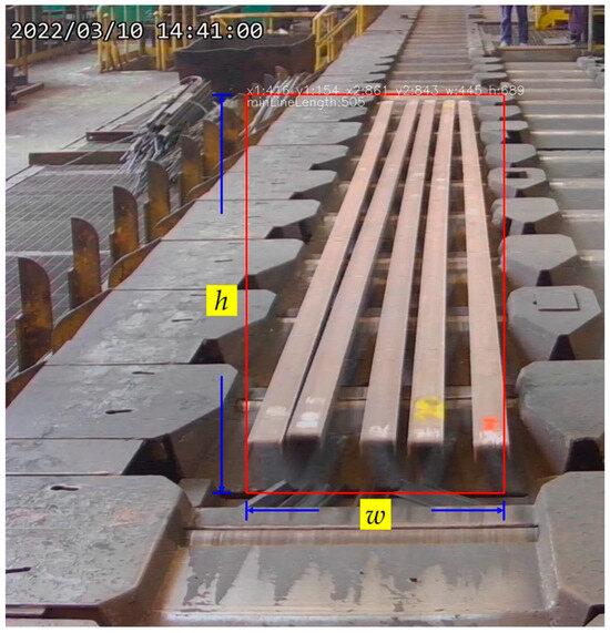 Region detection aims to establish a dynamic bending detection standard for different steel bar models by using the bounding box length of the steel bar batch, obtained through object recognition, as a reference. A YOLOv5 model, trained with collected and labeled data using a methodology similar to the bottom detection process, is developed to recognize the bounding box encompassing the steel bar batch. Figure 7 presents the recognition results. The bounding box coordinates are denoted as (, ) and (, ), representing the lower-left and upper-right corners, respectively. The width and height of the bounding box are represented by w and h. The minimum line length () refers to the minimum acceptable length of the straight edge of a steel bar.