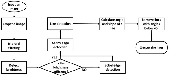 Upon successful detection of steel bar bottom objects, the edge and line detection algorithms are initiated. Conversely, in the absence of detected bottom objects, these subsequent processing stages are bypassed. Prior to edge detection, image cropping and bilateral filtering are applied. Image cropping isolates a rectangular region of interest within the camera-captured image, thereby reducing computational overhead for subsequent image processing. Bilateral filtering serves to enhance image features.