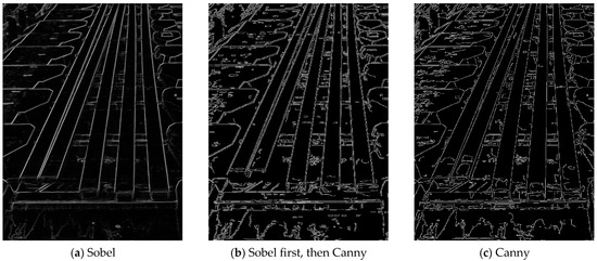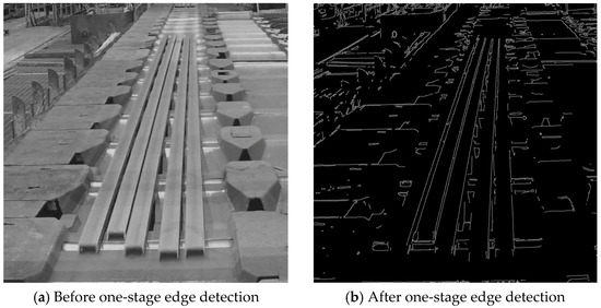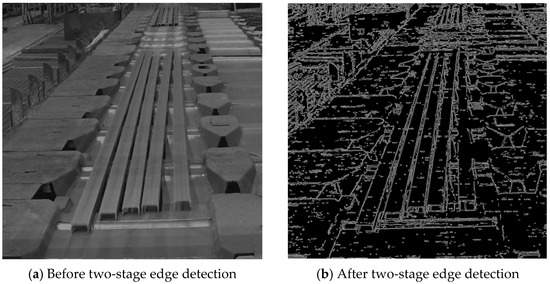 This study employs one-stage and two-stage edge detection to reconstruct the contour of steel bars. The choice between one-stage and two-stage methods is based on the threshold value of the average brightness, , which is set to 116 in this study. The first stage utilizes the Sobel operator with convolution to generate coarse edge maps, as illustrated in Figure 9a. Subsequently, the Canny edge detector refines these coarse edges, yielding precise edge contours, as shown in Figure 9b. Conversely, when the value exceeds , a one-stage Canny edge detection method is applied, resulting in the direct generation of steel bar edges, as depicted in Figure 9c.