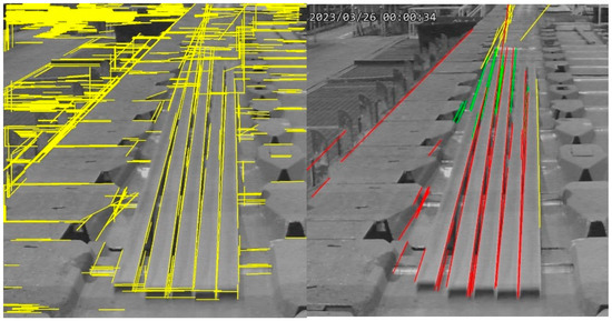 Post-detection, noise reduction is performed by eliminating all lines with slopes within ±45 degrees of the horizontal axis, effectively removing near-horizontal lines. This noise filtering procedure is illustrated in Figure 12.