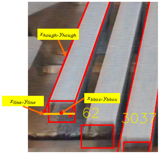 A line grouping algorithm is employed to calculate the slope and angle of each line segment, extending these segments to the bounding box (bbox) of the steel bar’s bottom object detection. Subsequently, the difference between the line segment’s y-coordinate () and the bounding box’s y-coordinate () is computed. Using the line segment’s slope (), the x-coordinate () of the line segment at the bounding box is then derived, as shown in Equation (6).