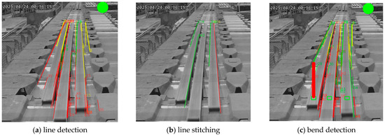 In specific scenarios, bending detection may persistently classify certain steel bars as bent, particularly those located at the track’s edges or when the camera operates in grayscale mode. This is attributed to the edge detection algorithm’s inability to clearly delineate edges in these instances, resulting in insufficient line segments for stitching. To address this, the criteria are relaxed for edge steel bars and grayscale images, permitting a single line segment satisfying the to qualify as straight. The general and relaxed modes for straightness determination are defined by Equations (13) and (14), respectively.