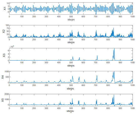 A nonlinear simulation system containing five variables is designed in this study, with each variable having a length of . The system equation is as follows: