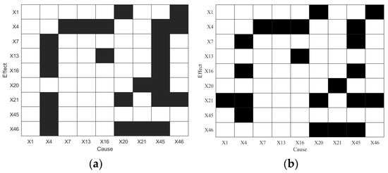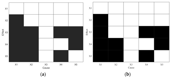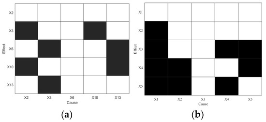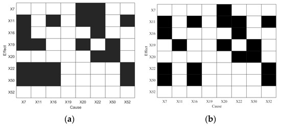 Figure 3 presents the causality diagrams derived from the numerical simulation using TE and PTE, respectively. In these diagrams, the horizontal axis represents cause variables and the vertical axis represents effect variables. A black cell indicates a detected causal relationship between the corresponding variable pair, while a white cell indicates no causal link. If a variable’s entire row is white (no outgoing influence), but its column contains black cells (incoming influence), this suggests that the variable is the root cause of the disturbance.