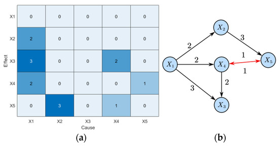 Next, LSTE is applied to diagnose the root cause of IDV5. The maximum lag is set to . The causal strengths among the selected variables, along with their statistical significance, are reported in Table 4, and the corresponding causality diagram is shown to occurring after nine sampling intervals.