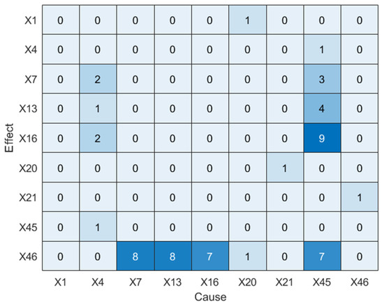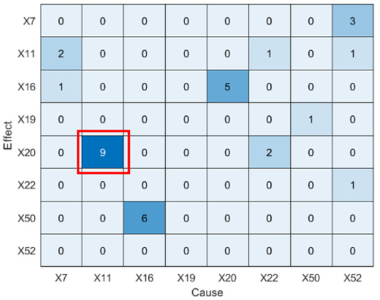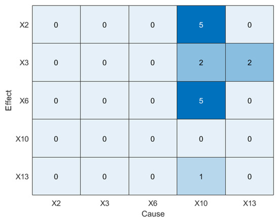In Figure 7. Statistically significant values (p < 0.05) are highlighted in bold. In addition, in the causality diagram, the x-axis and y-axis represent the same set of variables (i.e., disturbance variables ), with the x-axis denoting cause variables and the y-axis denoting effect variables. Each color block indicates the presence and strength of information transfer between variable pairs at specific time lags. The red box highlights a detected directional influence from to occurring after 9 sampling intervals.