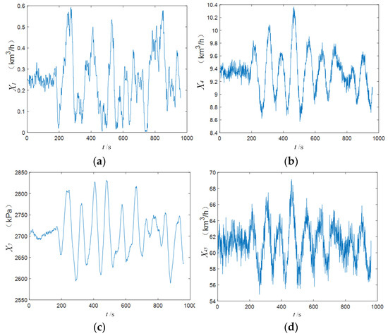 The change track of some variables (IDV5): (a) variable (temperature), (b) variable (flow), (c) variable (temperature), and (d) variable (flow).
