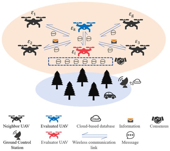 A UAV system consists of four core modules: hardware, software, radio communication links, and application software []. The hardware platform includes the flight controller, sensors, actuators, and the UAV body. The flight controller serves as the core unit, coordinating the guidance, control, and navigation systems, while the sensor array collects data such as speed and altitude. The software platform is responsible for UAV trajectory control, the navigation system determines the position, the guidance system directs the UAV to the destination, and the control system ensures precise flight. The communication link is used for data and command transmission, including communication between UAVs and ground stations, inter-UAV communication, and local link communication. Application software is used for task execution, such as trust computation, consistency evaluation, and dynamic adjustments, running on the onboard computer.
