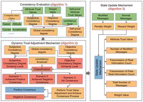 GDM-DTM constructs a hierarchical and progressive trust management system by integrating three core components: the Consistency Evaluation Algorithm (Algorithm 1), the Dynamic Trust Adjustment Mechanism (Algorithm 2), and the State Update Mechanism (Algorithm 3), as illustrated in Figure 2. These components are designed to work in a sequential and interdependent manner to support real-time and adaptive trust evaluation in UAV networks under adversarial conditions.