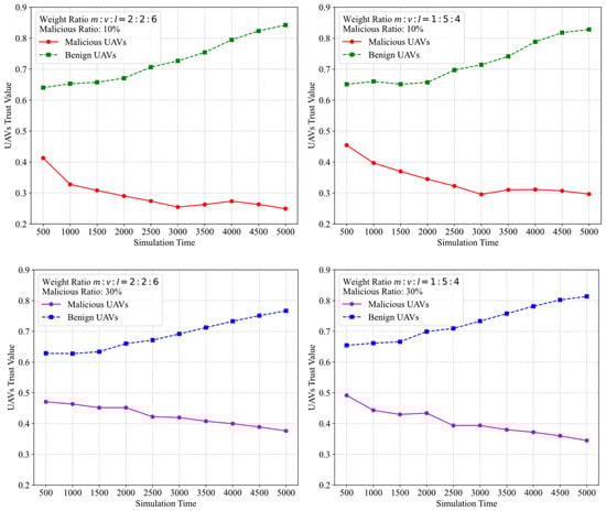 The experimental results indicate that although different weight combinations affect the overall trust level, the trust mean for benign UAVs increases over time across all configurations, while the trust mean for malicious UAVs gradually decreases. As the malicious ratio increases, the rate of change of the trust value decreases. The core mechanisms behind these findings are as follows: (1) The Dynamic Trust Adjustment Mechanism adjusts trust values based on the results of information transmission, enhancing the trust in benign nodes and suppressing malicious nodes. (2) Multi-level consistency evaluation (subjective, objective, global, and self-proof consistency) comprehensively identifies abnormal attributes, such as the divergence between global consensus and self-proof trust, triggering dynamic trust adjustments and improving detection sensitivity. (3) The dynamic update strategy for the weight matrix and confidence level optimizes the reliability and anti-interference capability of group decision-making. (4) The accumulation of information over time in the simulation provides data support for multi-dimensional attribute statistical analysis, effectively weakening the short-term camouflage effects of malicious nodes. In conclusion, the experimental results validate the system’s effectiveness in distinguishing benign and malicious UAVs. The system ensures trust value reliability with good robustness across different malicious node ratios and weight configurations.