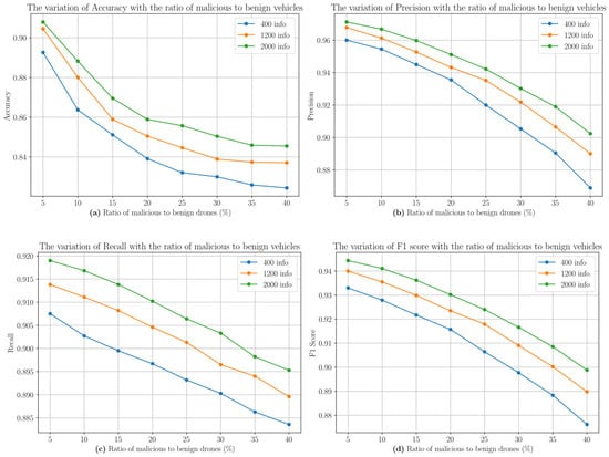 As shown in Figure 4a, the system’s accuracy gradually decreases as the ratio of malicious UAVs () increases. When the number of messages is 2000, the accuracy reaches 90.79% at  and remains at 84.55% when . Notably, the amount of information has a significant impact on system performance: when , increasing the number of messages from 400 to 2000 results in a 1.98% increase in accuracy (83.91% to 85.89%). This phenomenon stems from the dual effects of the Dynamic Trust Adjustment Mechanism: on one hand, the weight normalization strategy weakens the impact of coordinated attacks by malicious nodes on a single attribute; on the other hand, the confidence update model introduced in Equation (24) incorporates the feedback on information authenticity into the evaluation system, effectively suppressing the self-reinforcing effect of collusive networks. The experimental results show that the system maintains 83% detection accuracy even in high malicious ratio scenarios (), validating the environmental adaptability of the group decision-making mechanism.