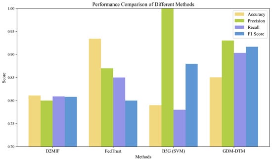 Performance comparison of GDM-DTM, D2MIF, FedTrust, and B5G (SVM).