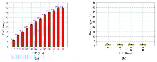 Changes in the DoS values of (a) AA5456; (b) AA5052, heat treated at 120 °C, measured using nitric acid mass loss test (NAMLT). The black lines indicate the variance between two match-stick samples.