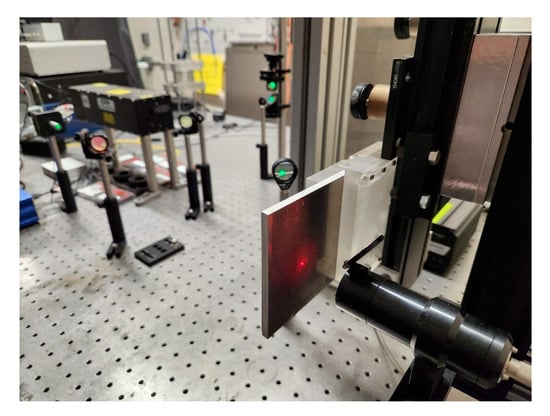 The impulse responses of the sample plates were measured using an LUT system from Intelligent Optical Systems (IOS) in B-scan mode, as shown in Figure 2. The excitation laser was a Q-switched free space Nd:YAG pulse laser (Quantel ICE 450 with Ultra laser head, Quantel laser by lumibird, Bozeman, MT, USA), positioned to the left side of the sample plate. It has a wavelength of 1064 nm and a peak energy of 200 mJ. The energy of the laser pulse was limited to 12% of the total energy, which was controlled by the laser control software (AtCalibration 5.1.2). The pulse width of the excitation laser is 10 ns at a repetition rate of 5 Hz. Using a spherical lens with a 200 mm focal length, the focus of the excitation laser was adjusted to be just above the abrasion limit of the material, i.e., it leaves a barely visible scar on the sample surface. Under this mode, the laser-generated ultrasound guided wave is dominated by the longitudinal wave that propagates normally to the sample surface []. The out-of-plane displacement of the sample plates was measured near the irradiation point at the opposite side of irradiation using an adaptive two-wave mixing laser interferometer. The sensing laser was a 1550 nm continuous wave fiber laser with a 2 W peak power, connected to a variable power splitter that outputs a probe beam and a reference beam (IOS AIR-1550-TWM Laser Ultrasonic Inspection System). The probe beam is directed at the sample surface and its reflection is collected by a fiber bundle. These two beams interfere at an angle in a photorefractive crystal to produce a real-time interference hologram, converting the phase change of the reflected beam, induced by the surface displacement of the sample, into an amplitude change []. During this research, attenuation was observed to increase approximately linearly with frequency across the measured range; this linear relationship was most pronounced between 10 and 16 MHz. To improve signal strength in the 10–16 MHz band, the interferometer’s variable power splitter was adjusted to boost the detected signal amplitude. This adjustment did not alter the inherent linear frequency-attenuation trend. The output signal of the laser interferometer was acquired using a National Instruments 8-bit data acquisition card (NI PCI-5114), housed in a personal computer (PC). The data acquisition process was configured and controlled using the LaserScan v2.36 provided by IOS and triggered by the sync signal generated by the excitation laser. The acquired data were filtered using a 20 MHz low-pass filter provided by the Laser-Scan software.