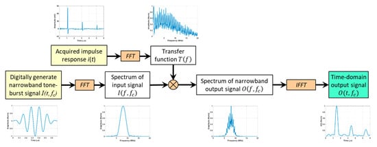 The narrowband tone-burst signal , as shown in Figure 3, can be digitally generated as a tone-burst signal with an arbitrary center frequency . As shown in Figure 3, the narrow band response of the sample plate , calculated using Equations (1) and (2), has multiple peaks at the same arrival times as the impulse response. These peaks are not as sharp due to their narrow bandwidths. Assuming there is sufficient time separation between the peaks, the attenuation parameter at the tone-burst center frequency, i.e., , can be determined by either fitting the amplitudes of the first few peaks to the exponential decay model [,], i.e.,