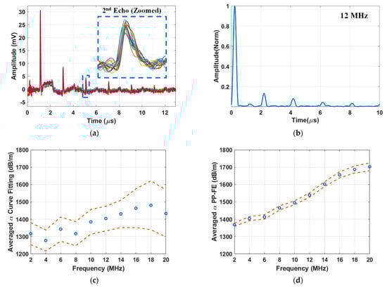 Laser ultrasound test results of AA5456 #1 after 168 h of heat treatment (DoS = 39.8 mg/cm2) (a) the broadband response of the sample plate measured at 51 B-scan locations; each different colored trace represents an individual measurement at one location; (b) Narrowband response of the acquired signal from a single B-scan location, calculated using the time-frequency analysis technique with a 12 MHz tone-burst input signal. Changes in the averaged B-scan attenuation parameter with the input frequency, determined using (c) the curve fitting method and (d) the PP-FE method. Dashed lines represent the upper and lower limits of the 95% confidence interval of 51 B-scan measurements.
