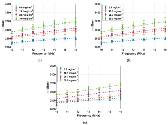 Figure 5 presents the frequency-dependent attenuation parameter, calculated using the PP-FE method, for the three AA5456 samples at four different DoS values, 6.9 mg/cm2, 19.1 mg/cm2, 28.7 mg/cm2, and 39.9 mg/cm2. The corresponding heat treatment durations for these DoS values are Pristine, 24 h, 60 h, and 168 h. The attenuation parameter values are plotted over the 10 MHz to 16 MHz frequency range with 1 MHz increments. Each data point represents the average attenuation parameter calculated from 51 B-scan measurements. The error bars represent the 95% confidence intervals of the average attenuation parameter at each DoS level. Each set of frequency-dependent attenuation values was fitted using a linear regression to extract the frequency-attenuation slope. The resulting fitted lines are shown as dashed lines. Across all three samples, the attenuation parameter consistently increases with both frequency and DoS. Despite some sample-to-sample variations, the slope of the frequency-attenuation relationship consistently increases with DoS.