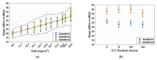 Averaged slopes of frequency-attenuation relationship as a function of DoS for (a) AA5456; (b) AA5052 samples. Each data point represents the slope extracted from the linear regression in Figure 5. Error bars indicate the combined uncertainty from the regression and the averaging process. The dash-dotted line in (a) shows the weighted linear fit across all AA5456 slopes, with dashed bounds accounting for both measurement and fitting errors using root-sum-square.