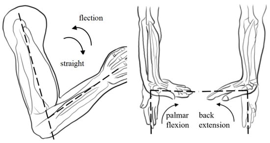 The human upper limb exhibits remarkable flexibility, primarily utilizing the shoulder, elbow, and wrist joints to perform various daily activities []. The primary motion range of the shoulder joint includes forward flexion/extension, abduction/adduction, and internal/external rotation. The elbow’s main movements include flexion/extension, posterior extension or hyperextension, and ulnar radial pronation/supination. The key wrist joint motions encompass palmar flexion/dorsal extension and ulnar/radial deviation. Our study primarily focused on upper limb rehabilitation exercises for the elbow joint with a normal range of motion (ROM) of 0–150° and a wrist joint with a normal range of motion (ROM) of −70–90° []. A schematic of the rehabilitation exercises is shown in Figure 1. Upper limb movement in humans is intricate and involves complex physiological structures such as muscles, bones, soft tissues, joints, and ligaments []. Implementing rehabilitation training for upper-limb exoskeletons across diverse scenarios presents significant challenges []. Consequently, this research emphasized localization and miniaturization, determining the exercise program of the upper limb exoskeleton rehabilitation training system based on human upper-limb movement characteristics.