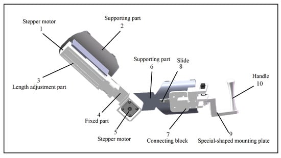 The design parameters were based on the Chinese National Standard for Adult Body Size (GB/T 10000-2023) [], which specifies an upper arm length of 251–350 mm and a forearm length of 185–243 mm. Taking into account the structural characteristics of the human body and the 2-degree-of-freedom rehabilitation posture, the design includes a 250 mm upper arm support with a 100 mm telescopic range, and a 190 mm forearm support with a 50 mm telescopic range. The structural design is illustrated in Figure 2.