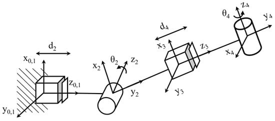 Using the D-H representation, the D-H coordinate system of the upper-limb rehabilitation exoskeleton robot was established. A four-degree-of-freedom upper-limb rehabilitation exoskeleton robot was designed in which the elbow contained one degree of freedom and the wrist contained one degree of freedom. The established link coordinate system is illustrated in Figure 3. Figure 3 shows the establishment of the model D-H coordinate system, including two telescopic joints and two rotational joints. θ2 and θ4 are the rotation angles of the rotational joints, the coordinate system of the shoulder fixed part is the O0 coordinate system, and the coordinate system of the end wrist part is the O4 coordinate system.