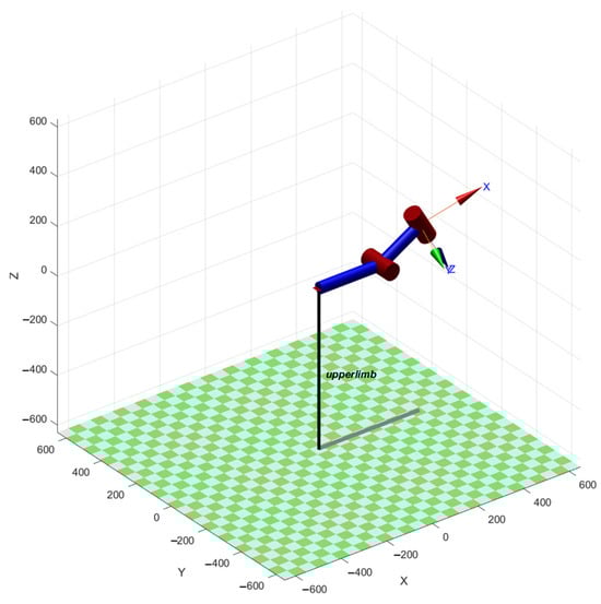 The upper-limb exoskeleton rehabilitation training system was modeled using a mathematical calculation and simulation analysis software. Let d2 = 270 mm, θ2 = pi/6, d4 = 200 mm, and θ4 = pi/9, as shown in Figure 4. After the comparison, it was found that the end position under the corresponding joint variables was consistent with the position and posture of the robotic arm, which verified the correctness of the kinematic model.