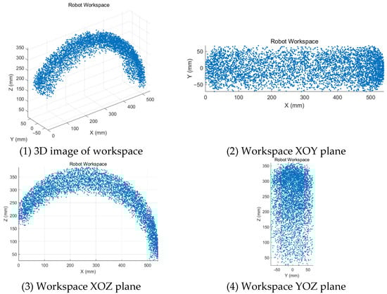 Within the given range of joint angles, a simulation analysis software was used to simulate random values, and 5000 random joint angles were generated in each joint space. The set of generated random points is the robot’s workspace, and the three-dimensional and two-dimensional cloud maps of the workspace of the robot are established, as shown in Figure 5. The resulting 3D workspace resembles a toroidal volume segment that closely matches the natural range of motion of the human upper limb for rehabilitation tasks. From the workspace point cloud map, it can be seen that the workspace of the exoskeleton is sufficiently large and dense, and the workspace adequately covers typical elbow and wrist motions required in clinical recovery exercises, such as flexion–extension and internal–external rotation.
