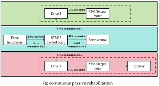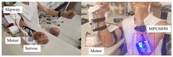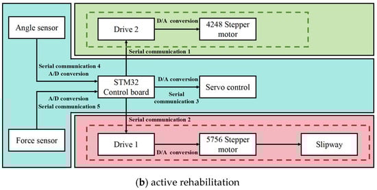 Figure 6 illustrates the block diagrams of these two control systems and clearly shows their working principles and complementary relationships. The lower-level control system provides continuous passive movement support to the impaired limb through mechanical transmission and dynamic models, whereas the angle sensor system achieves synchronized control between the healthy and impaired limbs through real-time monitoring and data transmission. The combination of these two systems forms a flexible and efficient rehabilitation training model that can dynamically adjust movement patterns and training intensity based on the patient’s rehabilitation progress and needs, thus providing a personalized rehabilitation program. Video S1 in the Supplementary Materials shows the dynamic process of the upper-limb exoskeleton system under active and passive rehabilitation modes. This system not only improves rehabilitation efficiency, but also offers a more precise and comfortable rehabilitation experience for the patient.
