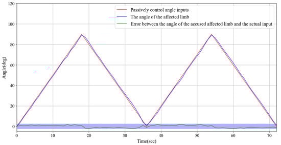 To achieve precise real-time monitoring of the rotation angle of the impaired limb, we utilized a high-precision angle sensor with the monitored angle data displayed on a screen for easy observation and recording. During the flexion and extension tests, the angle range was set from 0° to 90° to ensure that the test results covered the common range of limb movements. In the experimental design, the program-preset angle was used as the control group to provide a reference for the ideal movement trajectory, whereas the actual angle displayed by the impaired limb during movement was defined as the experimental group, serving as the key data source for validating the performance of the exoskeleton device. During the experiment, the exoskeleton motor, through precise torque control and speed adjustment, effectively guided the impaired limb to move stably along a predetermined angle trajectory, demonstrating excellent follow-through performance. Figure 8 presents the specific test results, which confirm the high stability and controllability of the exoskeleton system. In addition, by adjusting the rotational speed of the motor, the system can accommodate the individual needs of different patients and provide flexible rehabilitation training schemes. For instance, training can start with low-speed assistance and gradually increase the range of motion and speed to promote the functional recovery of the impaired limb.