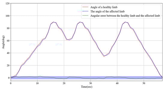 High-precision angle sensors were installed on both impaired and healthy limbs to continuously monitor and record their movement angles. The angle data were displayed on a screen in real time to facilitate observation and comparison. During the experiment, we set an angle range of 0–90° for the flexion and extension tests, ensuring that the tests covered the main range of limb movement. In the experimental design, the angle data of the healthy limb were used as a control group to provide an ideal reference for the movement trajectory, while the angle data of the impaired limb were used as the experimental variable to verify the ability of the device to guide the movement of the impaired limb in real time.