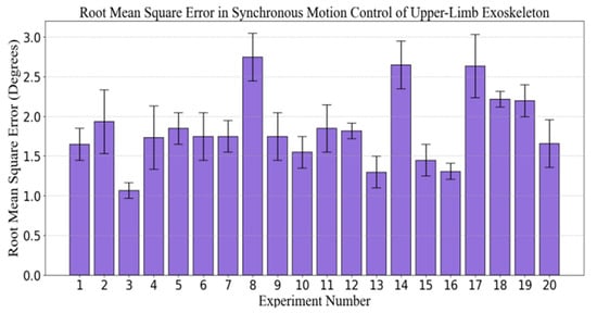 Each subject participated in multiple rehabilitation training sessions during which angular errors between the healthy and affected limbs were recorded. Specifically, the experiment monitored the angular difference between the healthy and affected limbs driven by the exoskeleton system in real time to analyze the precision of the system in synchronous motion control. After each training session, all angular error data were collected and organized, and the root mean square error (RMSE) was calculated (as shown in Figure 10) for each subject during different training sessions.