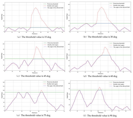 In this study, training conditions were evaluated across different threshold ranges, with several staged ranges set, including 0–15°, 0–30°, 0–45°, 0–60°, 0–75°, and 0–90°, to simulate various rehabilitation stages. During the operation, when the movement of the healthy limb exceeds the set threshold, the rehabilitation device immediately activates a safety mechanism to prevent excessive movement of the impaired limb, thereby avoiding injury caused by uncoordinated motion. Specifically, the movement of the impaired limb halts immediately, maintaining its current angle, and the impaired limb will only resume synchronized movement with the healthy limb once it returns to the same angle.