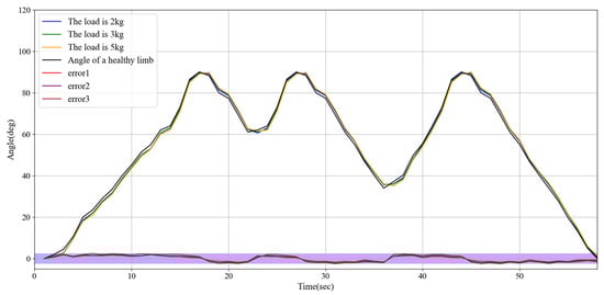 This experiment investigates the performance of the upper limb exoskeleton robot in synchronous movement under varying loads due to the differing limb weights of patients. This study aims to evaluate whether a robot can maintain adequate movement synchronization and accuracy under diverse load conditions. Different load conditions were established at the slave end: 2 kg (light), 3 kg (medium), and 5 kg (and heavy). Synchronous motion tests were conducted for each condition. Figure 12 illustrates the experimental results, demonstrating that the exoskeleton robot exhibits satisfactory adaptability under various loading conditions. The angle error for both the healthy limb and the affected limb remains within 2.5 degrees.